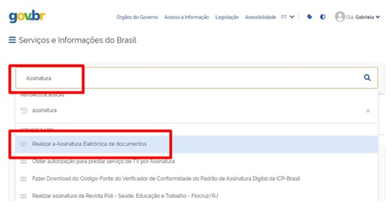 Na página inicial da sua área restrita do Gov.br há uma aba para pesquisa, digite “Assinatura”. Logo abaixo algumas opções ficarão disponíveis.