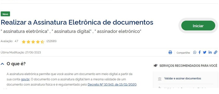 Para realizar a assinatura eletrônica, acesse o site Gov.BR.