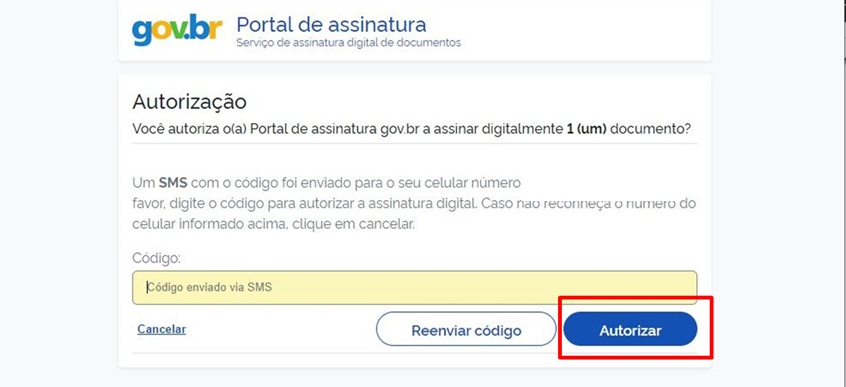 O sistema pedirá autorização para assinatura através de um código enviado por SMS ou para o Aplicativo Gov.Br, ao número disponibilizado no momento do cadastro. Adicione o código e clique em Autorizar.